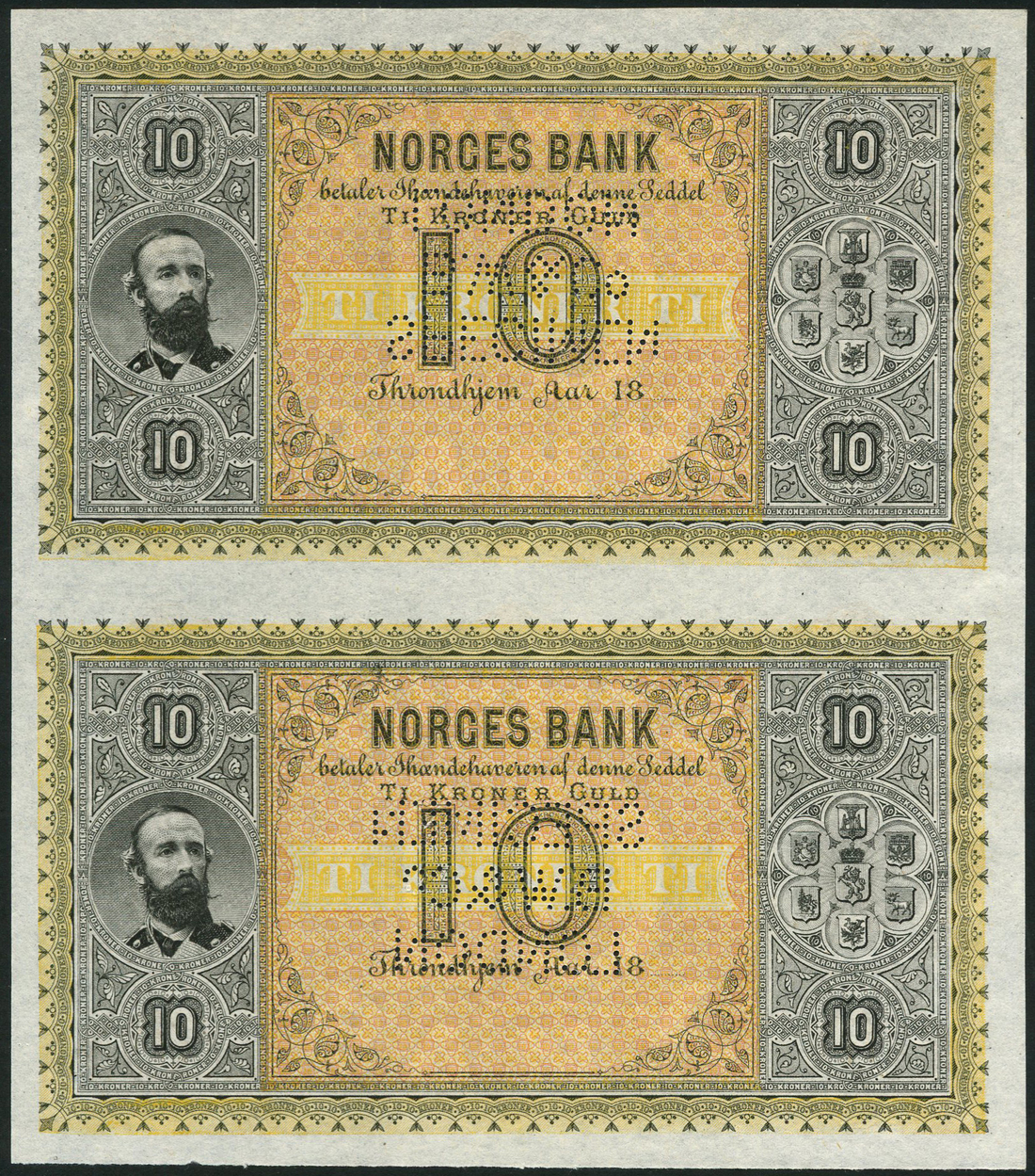 (†) Norges Bank, Norway, an uncut pair of specimen 10 Kroner, Trondheim, 18xx (ca 1877), no serial numbers, no signature, black on yellow and orange underprint, portrait of King Oscar II at left, seven coats of arms in circle at right, reverse yellow, value at centre and in each corner, medallic head at left, crowned arms at right, perforated SPECIMEN BW & Co LONDON