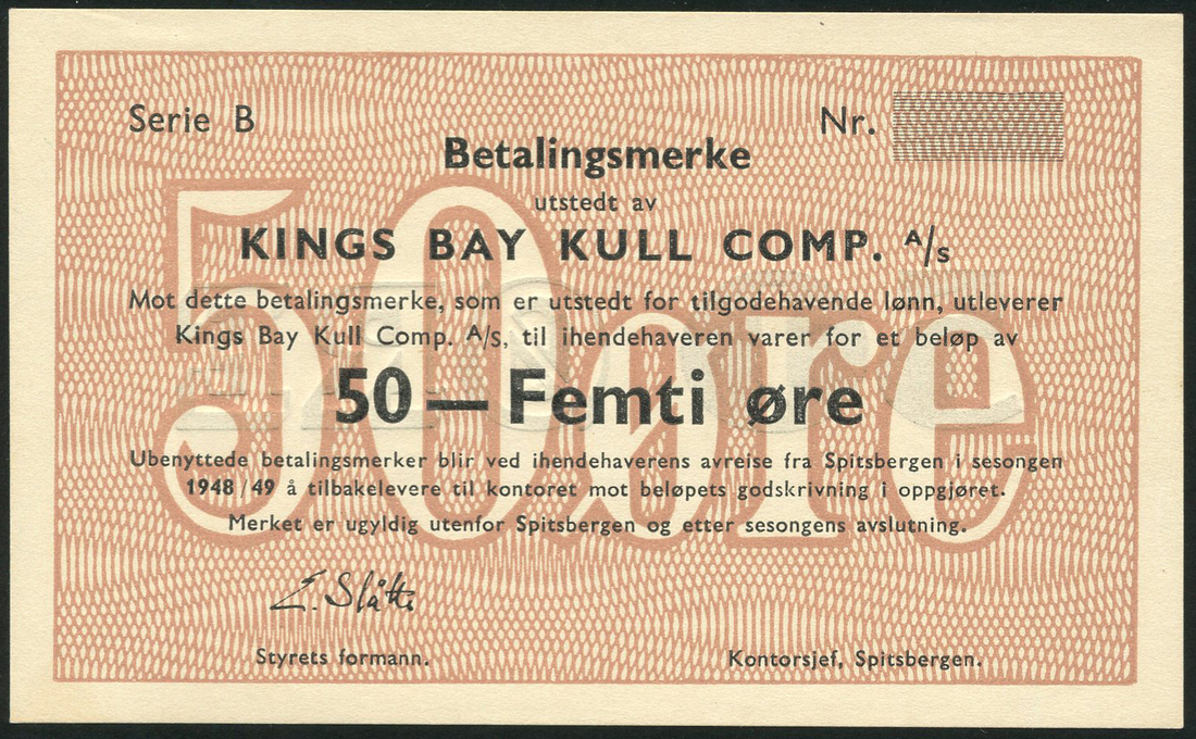 (x) Norway, Kings Bay Kull Comp., unissued 50 ore, 1948-49, no serial numbers, series B, black on pale brown underprint, reverse black,