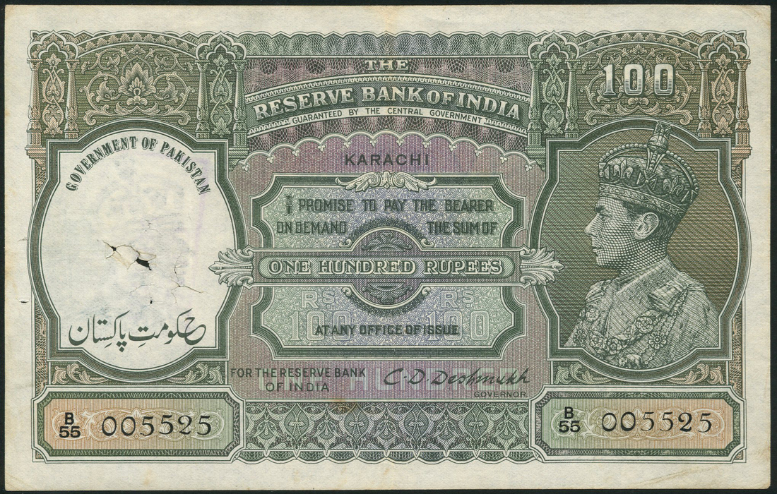 Pakistan, Reserve Bank of India, 100 rupees, Karachi, ND (1938-), serial number B/55 005525, green and lilac, George VI at right, Deshmukh signature, GOVERNMENT OF PAKISTAN in text at left, reverse green, tiger at centre