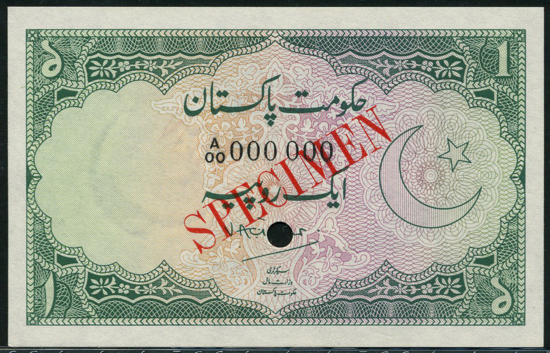 (†) Government of Pakistan, specimen 1 Rupee, ND (1949), serial number A/00 000000, green on multicoloured underprint, crescent moon and star at right, value in each corner, reverse arches at left, overprinted SPECIMEN in red on obverse and reverse, one cancel hole