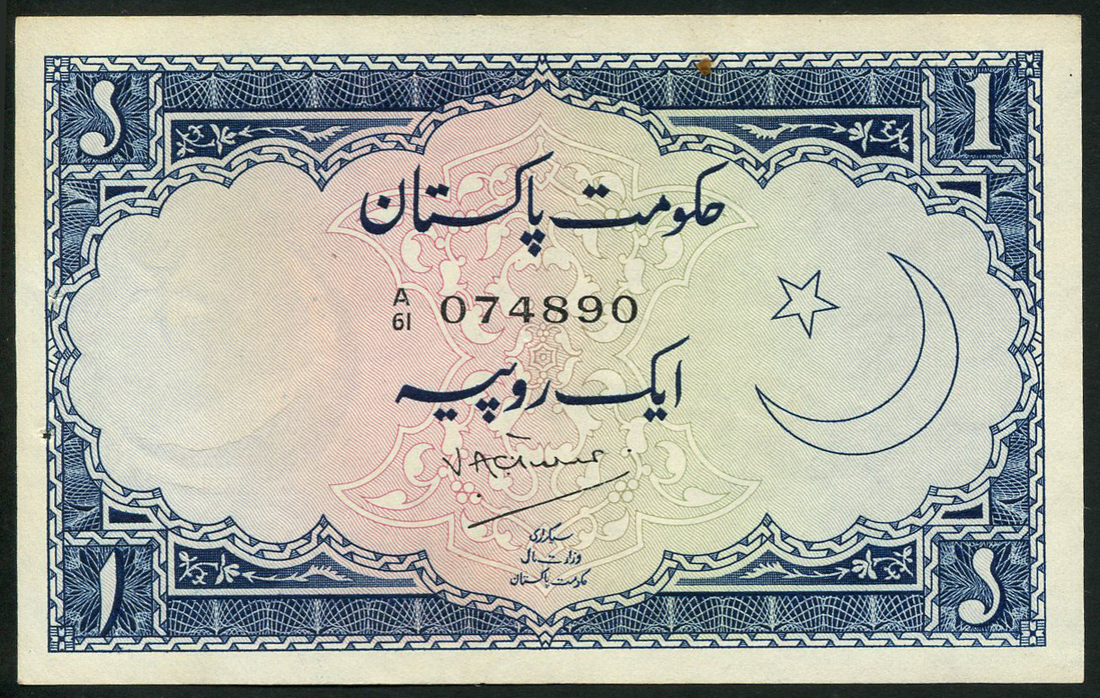 Government of Pakistan, 1 rupee (2), ND (1952), prefixes A 61 and B/72, blue and lilac, star and crescent at right, Turner and Qadir signatures respectively