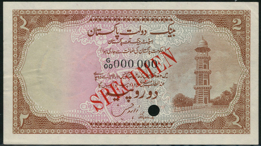 (†) State Bank of Pakistan, specimen 2 Rupees, ND (1949), serial number G/00 000000, brown on pink and light green underprint, tower on wall encircling the tomb of Jahingir in Lahore at right, value in each corner, reverse Badshahi Mosque, Lahore, red SPECIMEN overprint, on obverse and reverse, one punch hole