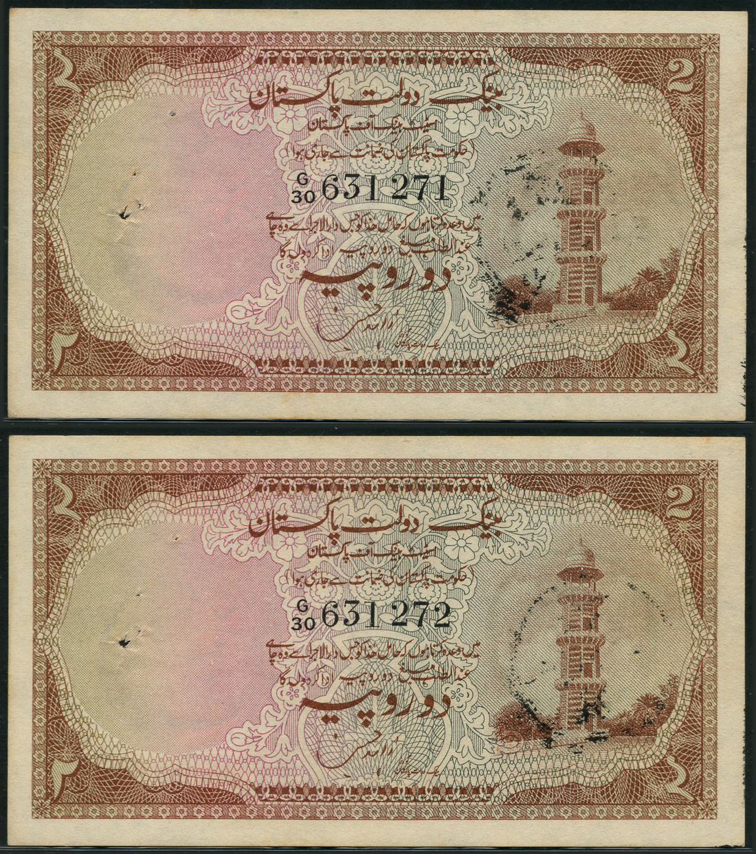(x) State Bank of Pakistan, 2 rupees (2), ND (1949-53), consecutive serial numbers G/30 631271-72, brown on pink and green underprint, Minaret at right, value at each corner, reverse brown, Badshahi Mosque