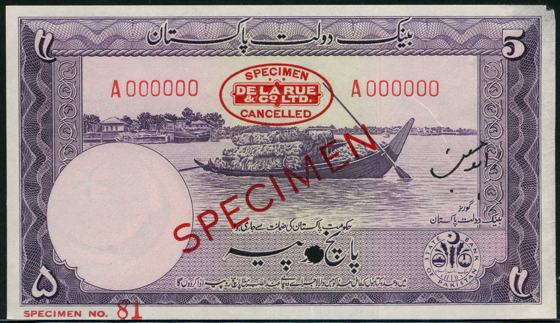 (†) State Bank of Pakistan, specimen 5 Rupees, ND (1951), serial number A 000000, purple on light green underprint, jute-laden boat at centre, reverse Khyber Pass, red SPECIMEN overprint with one De La Rue Specimen oval at upper centre
