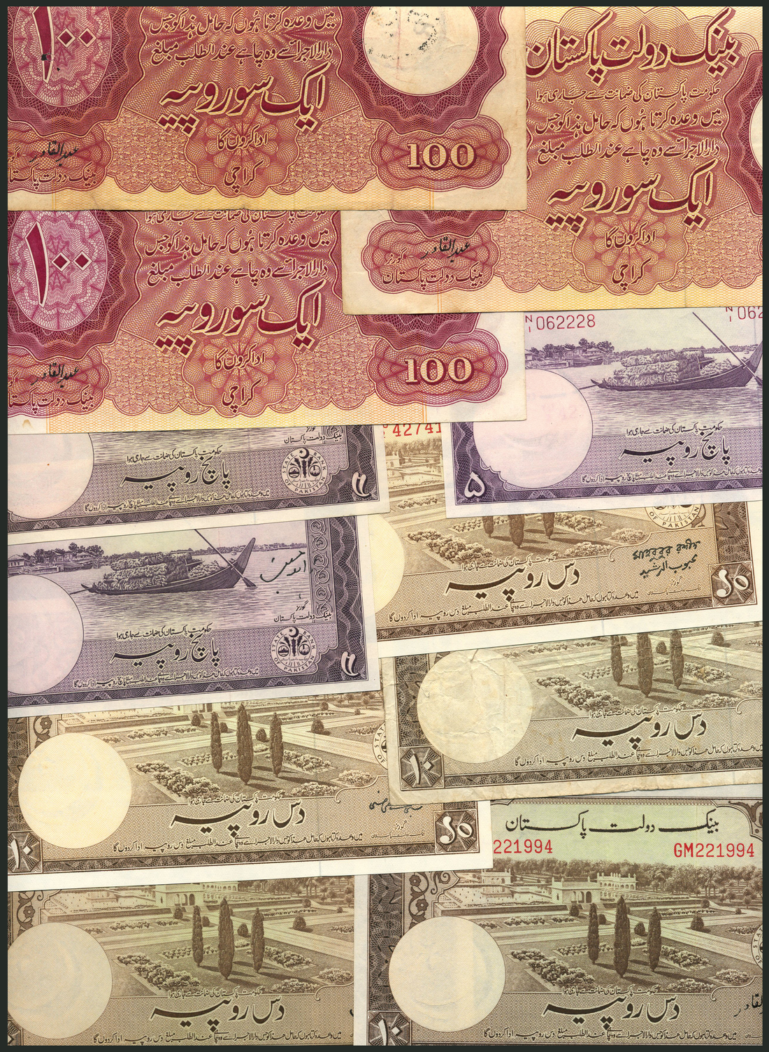 State Bank of Pakistan, 5 rupees (3), ND (1951-1960), purple, boat with jute at centre, signatures 1,2,3, 10 rupees (5), brown, Shalimar Gardens in Lahore at centre, signatures 1,2,3(2),5, 100 rupees (3), ND (1954), purple, value at left, signature 2, Karachi issue