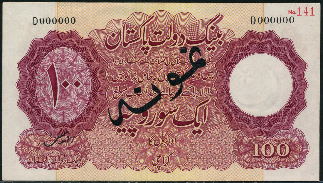 (†) State Bank of Pakistan, specimen 100 Rupees, ND (1953), serial number D/00 000000, reddish-purple on pale orange underprint, value in ornate guilloche at left and at lower right, reverse ornate geometric pattern, value in each corner, black overprint SPECIMEN in Urdu on obverse and reverse