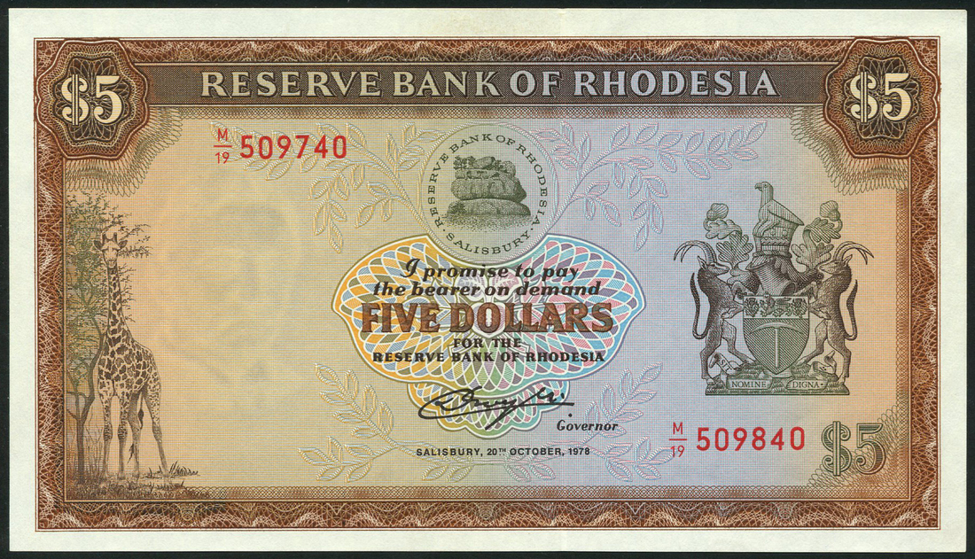 Reserve Bank of Rhodesia, $10, 20 October 1978, serial number M/19 509740/509840, brown and multicoloured, bank logo top centre, arms at right, signature of Doctor D.C.Krogh