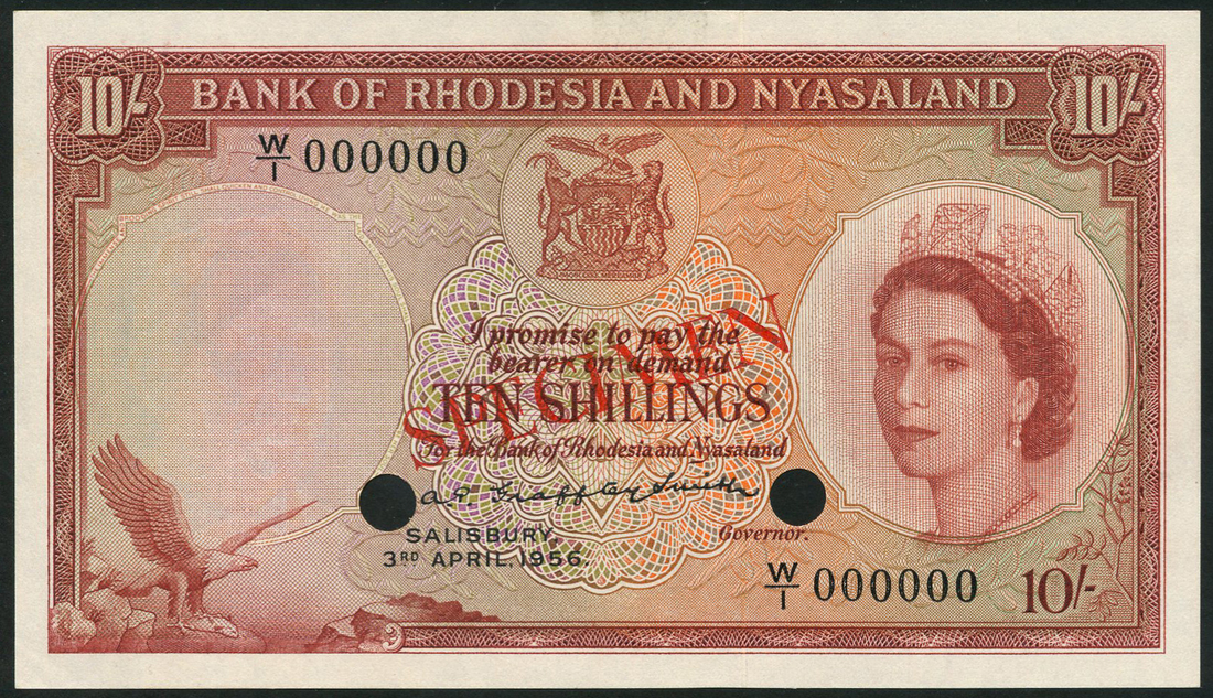 Bank of Rhodesia and Nyasaland, specimen 10/-, 3 April 1956, serial number W/1 000000, red-brown on multicolour underprint, Elizabeth II at right, Fish Eagle at low left, arms at top centre, two cancellation holes, red SPECIMEN overprint