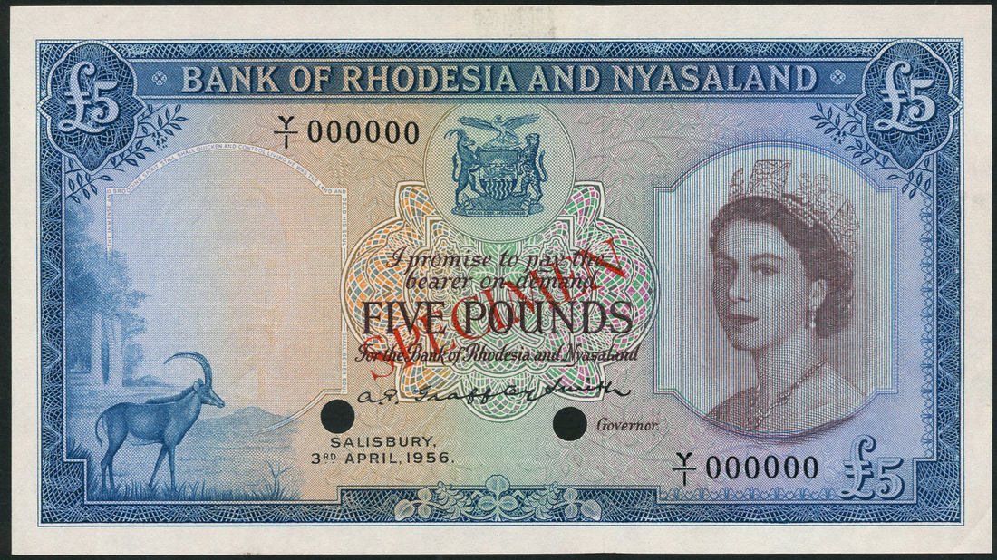 Bank of Rhodesia and Nyasaland, specimen £5, 3 April 1956, serial number Y/1 000000, blue on multicolour underprint, Elizabeth II at right, Sable Antelope at low left, arms at top centre, two cancellation holes, red SPECIMEN overprint
