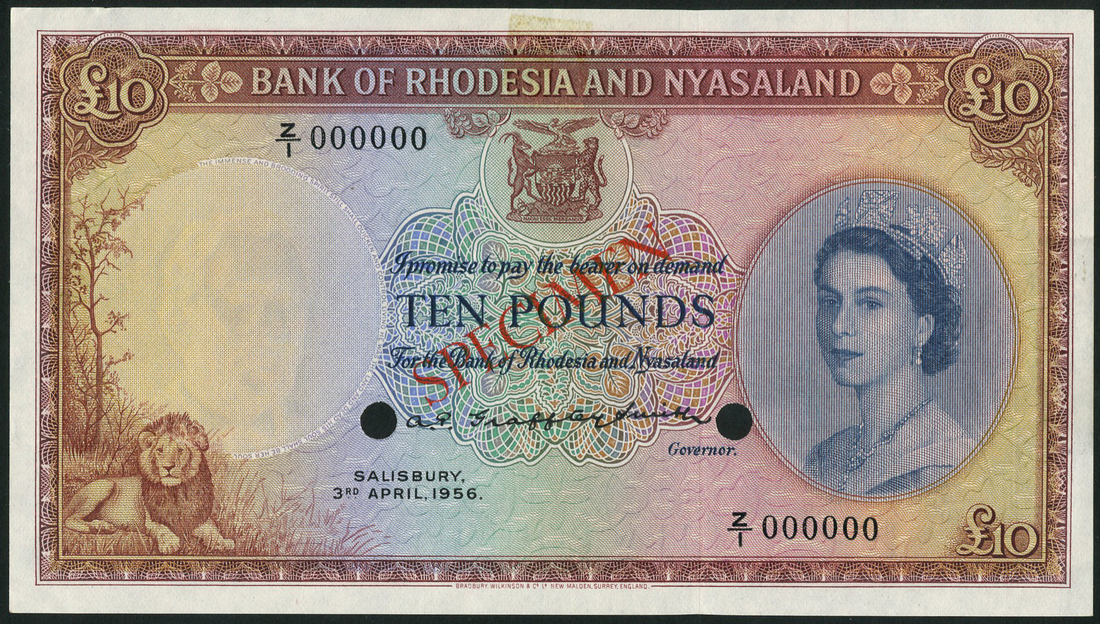 Bank of Rhodesia and Nyasaland, a full set of specimens, all dated 3 April 1956, prefixes W/1, X/1, Y/1 and Z/1, red, green, blue and brown respectively, Elizabeth II at right, arms at top centre, all with two cancellation holes and red SPECIMEN overprint