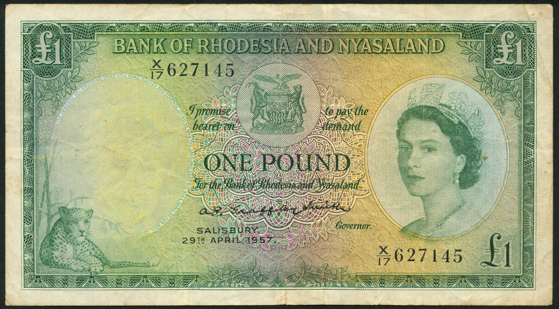 Bank of Rhodesia and Nyasaland, £1 (2), 29 April 1957 and 16 December 1960, prefixes X/17 and X/57, green on multicolour underprint, Elizabeth II at right, leopard at low left, arms at top centre