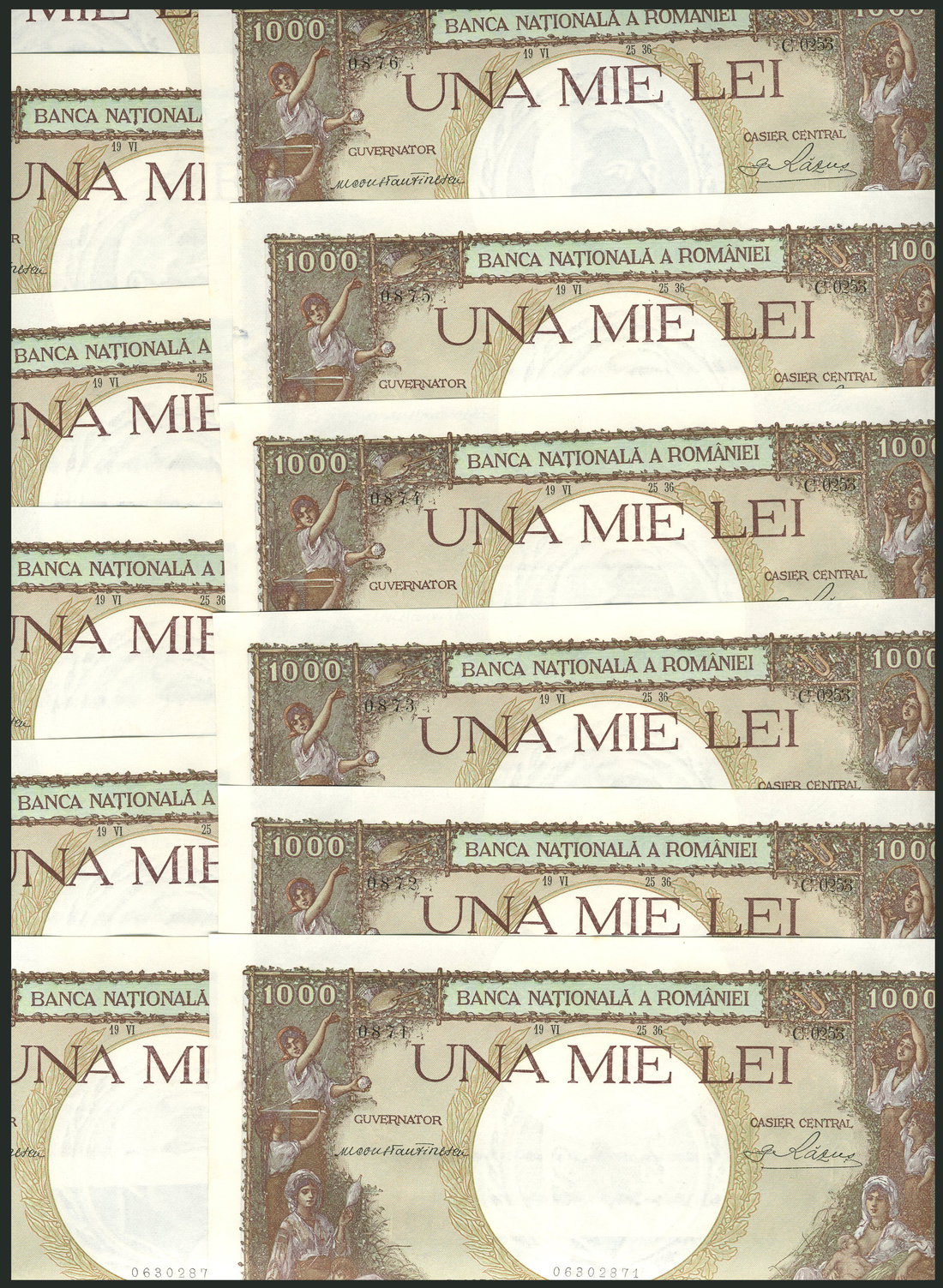 Banca Nationala A Romanei, 1000 Lei (17), 1938, consecutive serial numbers C.02530871-88 brown and green, watermark at centre flanked by two farm wives and children