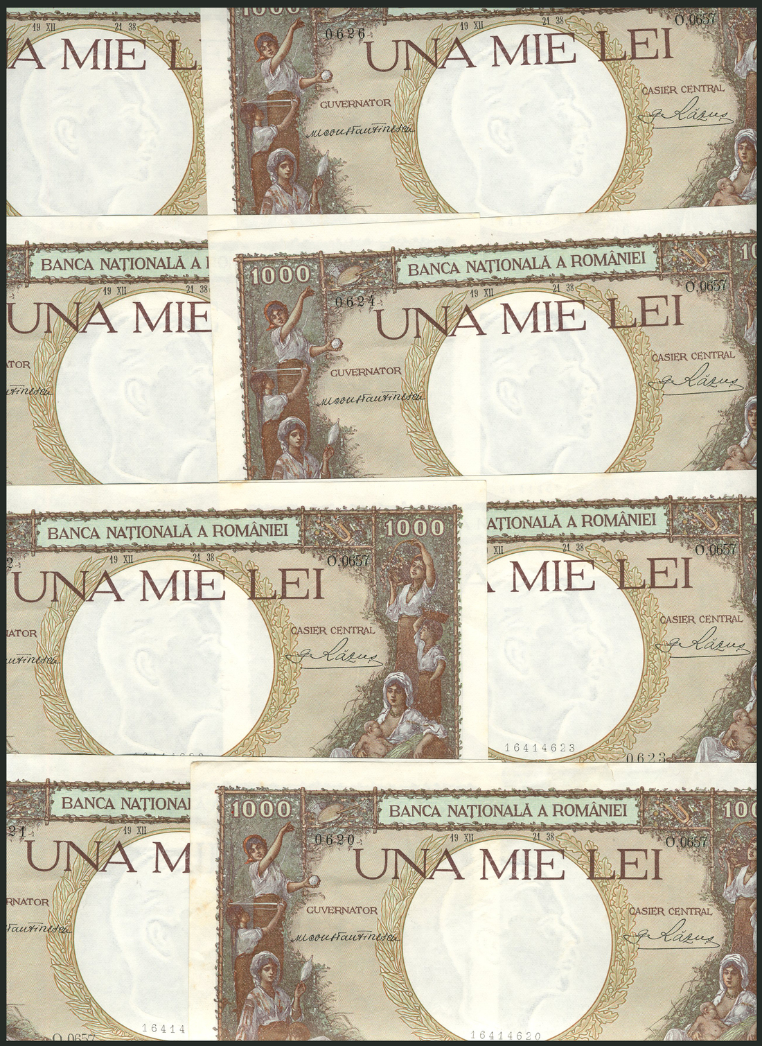 Banca Nationala A Romanei, 1000 Lei (14), 1938, consecutive serial numbers O.06570620-33 brown and green, watermark at centre flanked by two farm wives and children