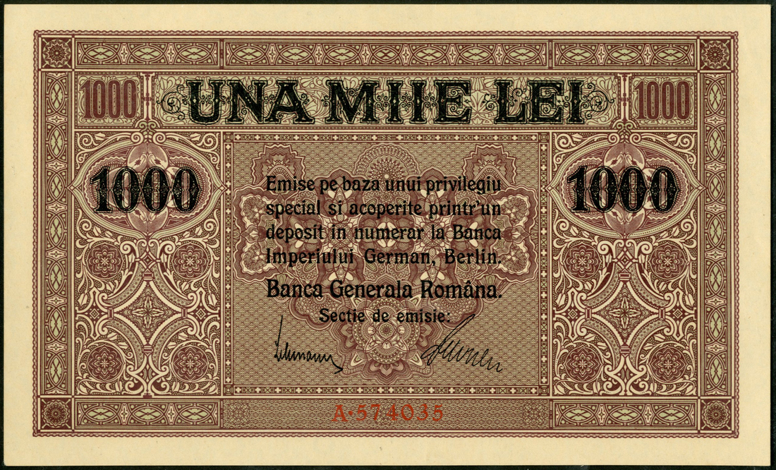 Romania, German Occupation, 1000 lei, 1917, serial number A.574035, black on red-brown underprint, ornate design with values at top left and right
