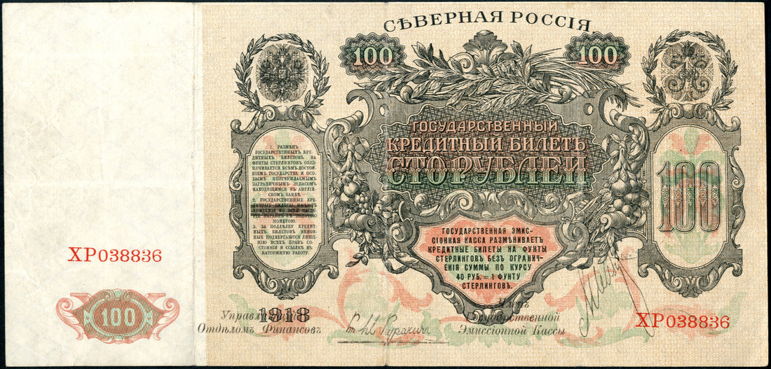 (x) Chaikovski Government, 100 rubles, 1918, serial number XP 038836, black print on brown, green and red, crowned doubled headed eagle at left, manuscript signature at lower, reverse allegorical maiden holding portrait