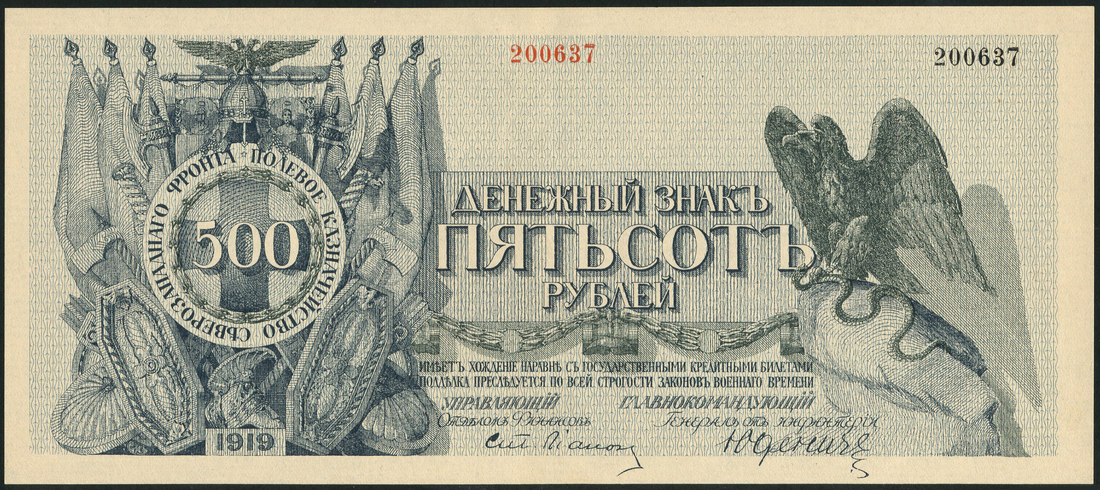 Northwest front - Yudenich Field Treasury, a complete set from the 1919 Issue, 25, 50 Kopeks, 1, 3, 5, 10, 25, 100, 500 and 1000 rubles,