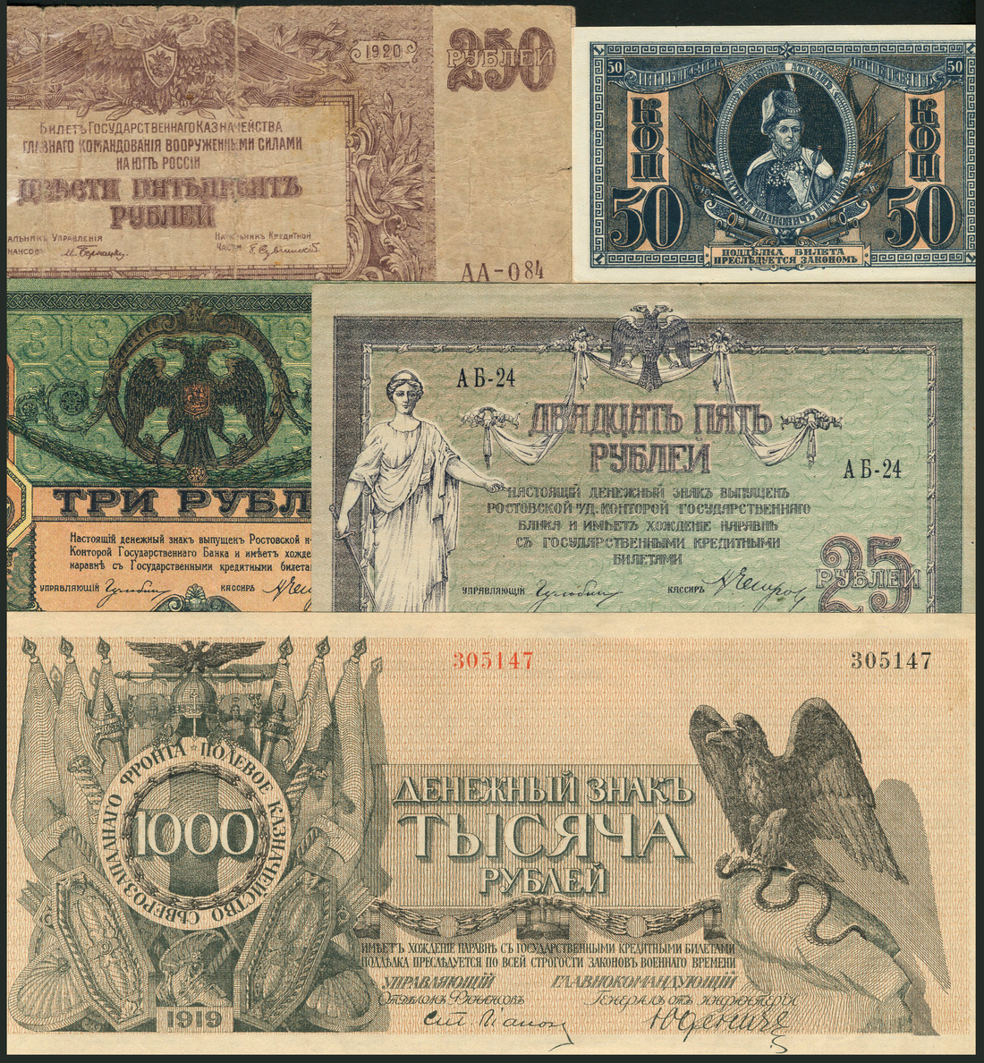 Field Treasury, Northwest Front, Russia, 1000 rubles, 1919, serial number 305147, black green on light pink underprint, flags and shields surrounding value at left, double headed eagle and snake at right, reverse, monument of Peter the Great at centre, double headed eagle in lilac centre background, together with a group of Russian notes consisting of 15 kopeks, ND (1917), brown, 50 kopeks, ND (1918), brown, double eagle at centre, 50 kopeks, ND (1918), black and grey on light orange, 3 rubles, 1918, black and green on orange underprint, 25 rubles, 1918, black and green on light brown underprint, 250 rubles, 1920, lilac brown
