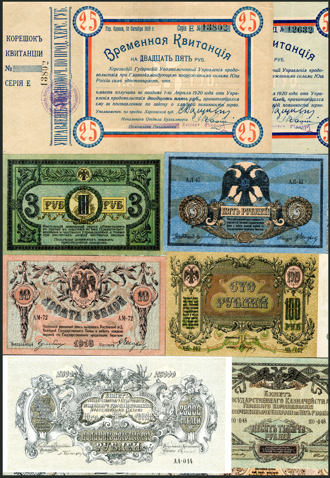Ukraine and Crimea, a group from the 1917-1923, comprising a full set from the Ukrainian Cooperative Bank 1917 issue, Zhytomyr, 500 and 100 rubles, 1918, Odessa Provincial receipts 25, 50, 100, 500 rubles, 1919, and other issues