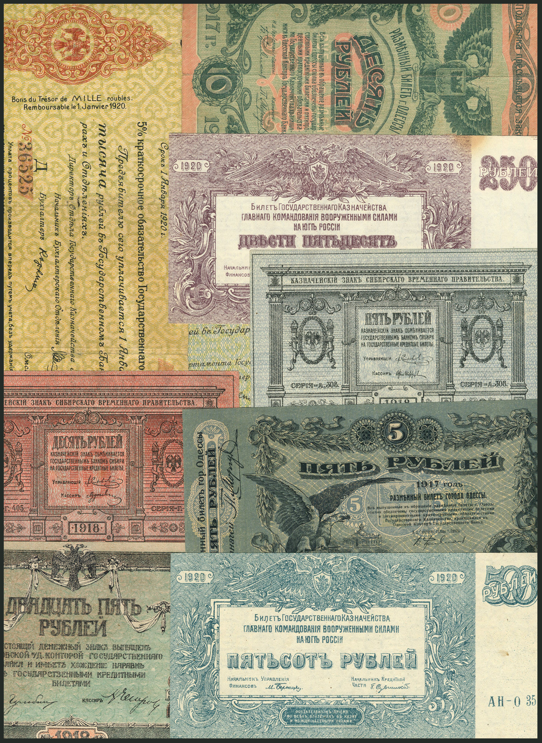 Russia, local issues, a group of regional/local issues, comprising Odessa region, 5 and 10 rubles, 1917, double headed eagles on face, South Russia, 25 rubles, 1918, maiden with sword at left, and 250 and 500 rubles, 1920, red and blue-green respectively, also Siberia, 5 and 10 rubles, 1918 issue, green and red respectively, also Siberia, 25, 50, 250, 500 and 1000 rubles, 1919, all with double headed eagle at left, value on the outside
