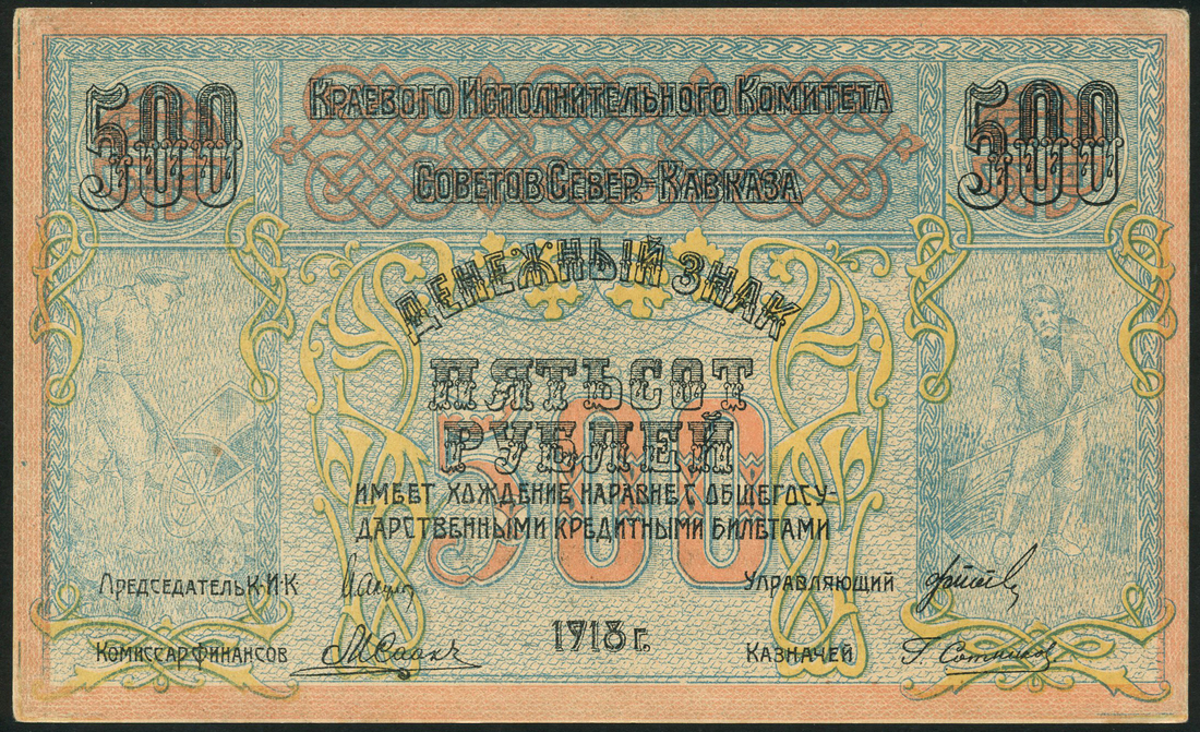 North Caucasian Soviet Republic, 500 rubles, 1918, series B-8, multicolour, value at centre, workers at left and right