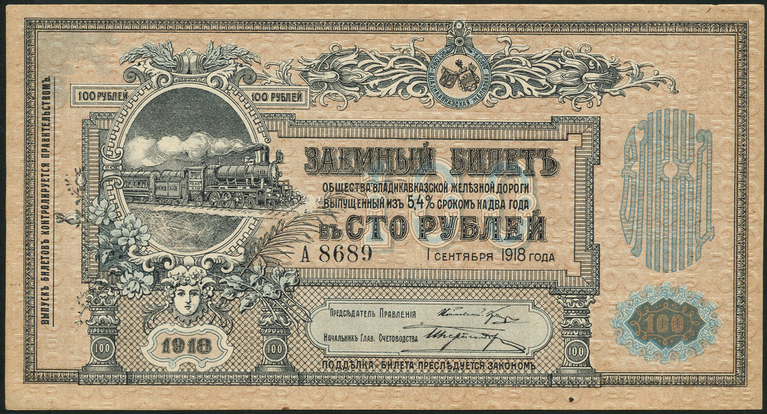 Vladikavkaz Railroad Company, a set of the 1918 issue comprising 50, 100, 500 and 1000 rubles, steam locomotives, bridges and buildings, all with map of the railroad on reverse