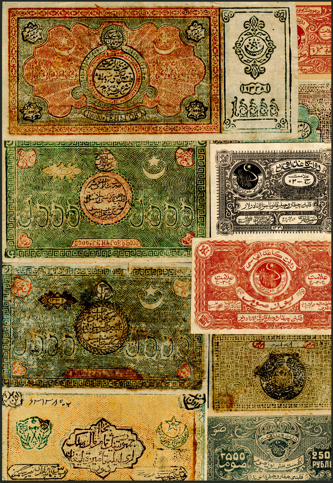 Russian Central Asia, Bukhara, a good group of 1920-22 issues, comprising 500, 5000 (2) and 10,000 tengas, 1920, 50, 100, 5000, 10,000 (2) and 20,000 rubles, 1920, 100 rubles, 1922 first issue, 5 and 100 rubles second issue, all woodblock printing, crescent and star motifs and values