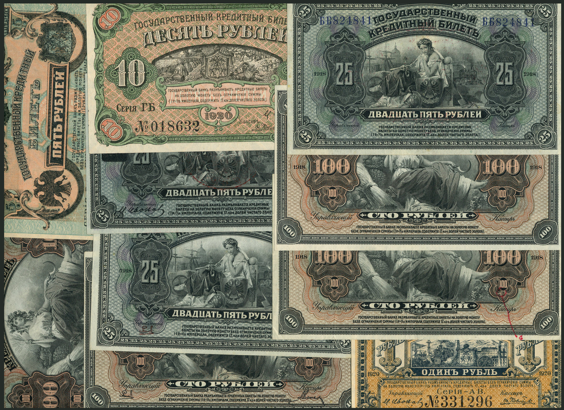 Far East Provisional Government, Priamur Region, a set of the 1918-19 government credit notes issue, comprising 1, 5, 10, 25 (2), 100 (2) rubles, 1920 and Provincial Power of the Pribaikal region 25, 100 rubles 1920 and an archival copy of 100 rubles showing secret letters