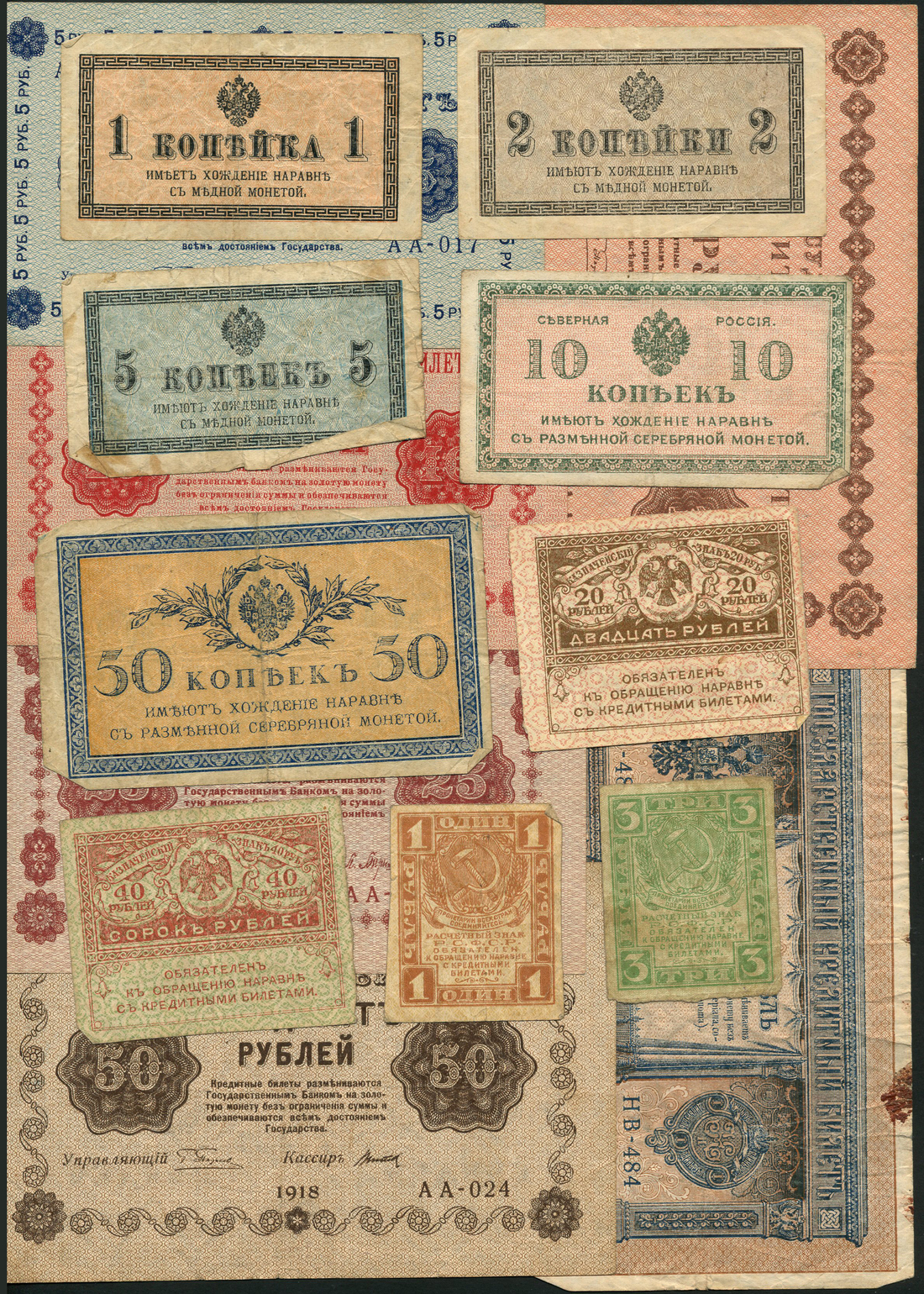 Treasury notes, Russia, 1 ruble, (1912-1917), Shipov signature variety, 1, 2, 5, 10, 50 kopeks, 1915, 20 and 40 rubles 1917, Currency notes 1 and 3 rubles, 1919, State Treasury notes, 1, 3, 5, 10, 25, 50 and 100 rubles, 1918, Currency notes, 50,000 rubles, 1921