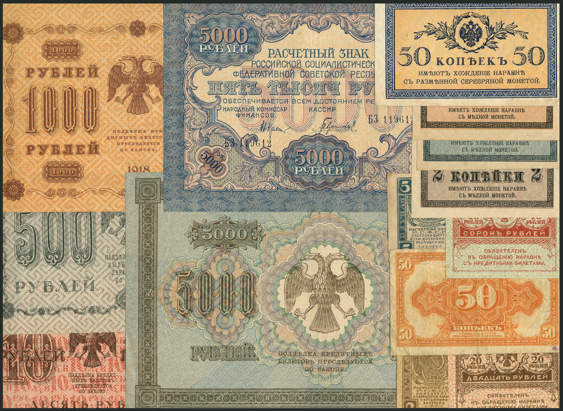 Russia, State Treasury notes, a nearly full set of the 1918 issue, comprising 1, 3, 5, 10, 25, 50, 100, 250, 500, 1000 and 5000 rubles, as well as a set of the 1919 currency note issues, comprising 15, 30, 60, 100, 500, 1000 and 5000 rubles, also a group of small change and postage stamp currency, comprising 2, 10, 15 and 20 kopeks, 1915, 1, 2, 3, 5 and 50 kopeks, 1915, 20 and 40 rubles, 1917, and 1, 2, 3 and 5 rubles, 1919, also Siberia, 50 kopeks, 1919, orange