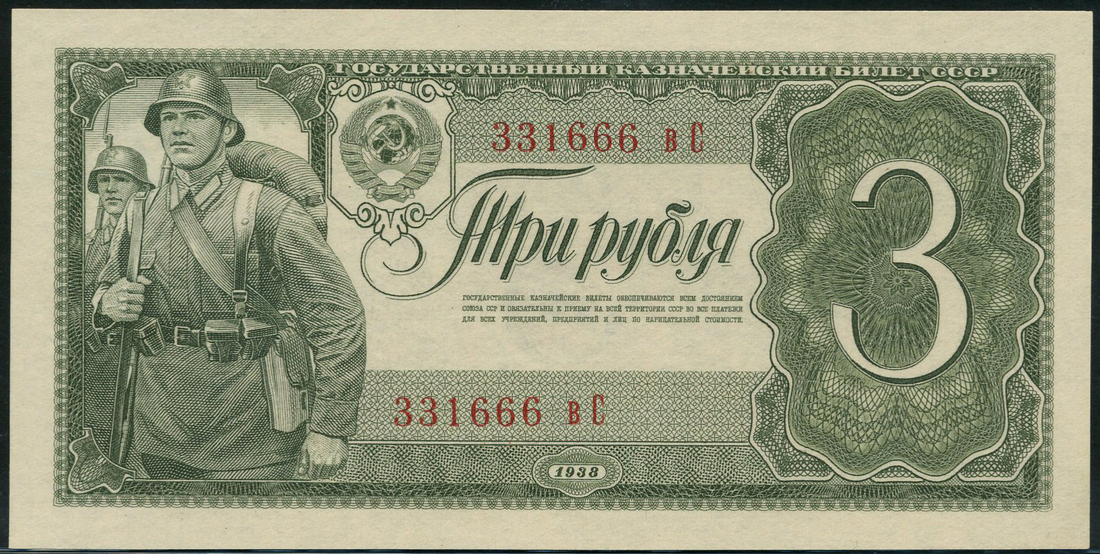 Russia, State Treasury, 3 rubles, 1938, serial number 331666, olive green on blue and red underprint, soldiers at left, value at right, arms at top left