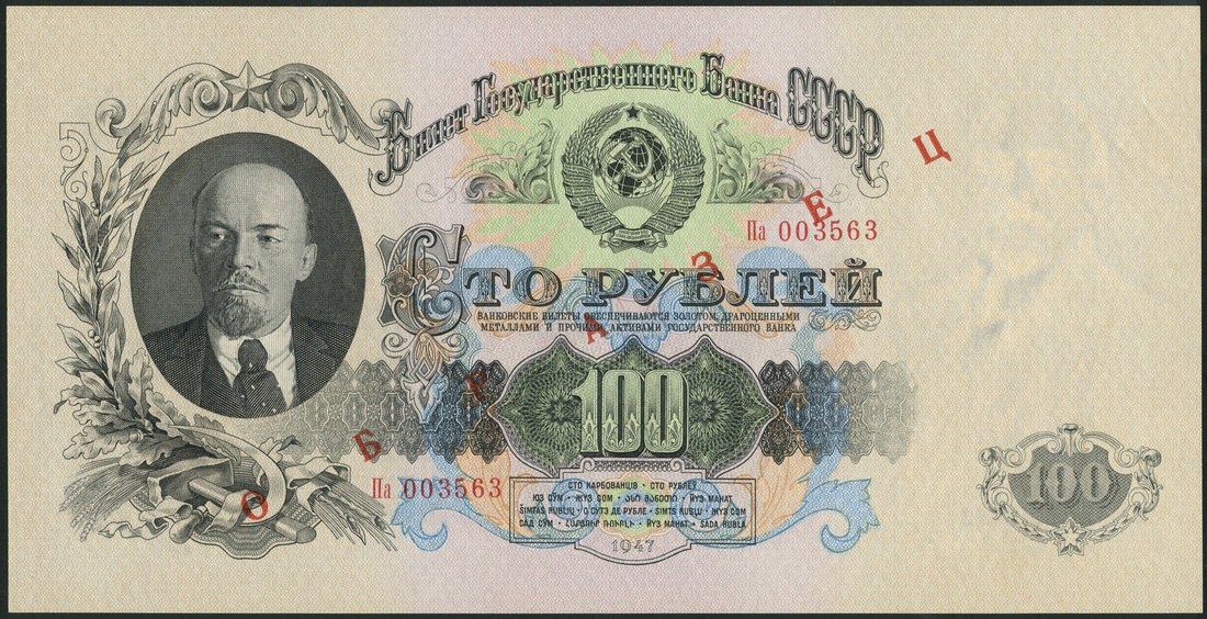 (x) State Bank Note U.S.S.R, Russia, a specimen set from the 1947 series comprising 1, 3, 5, 10, 25, 50 and 100 rubles, multicolour, with red SPECIMEN overprint