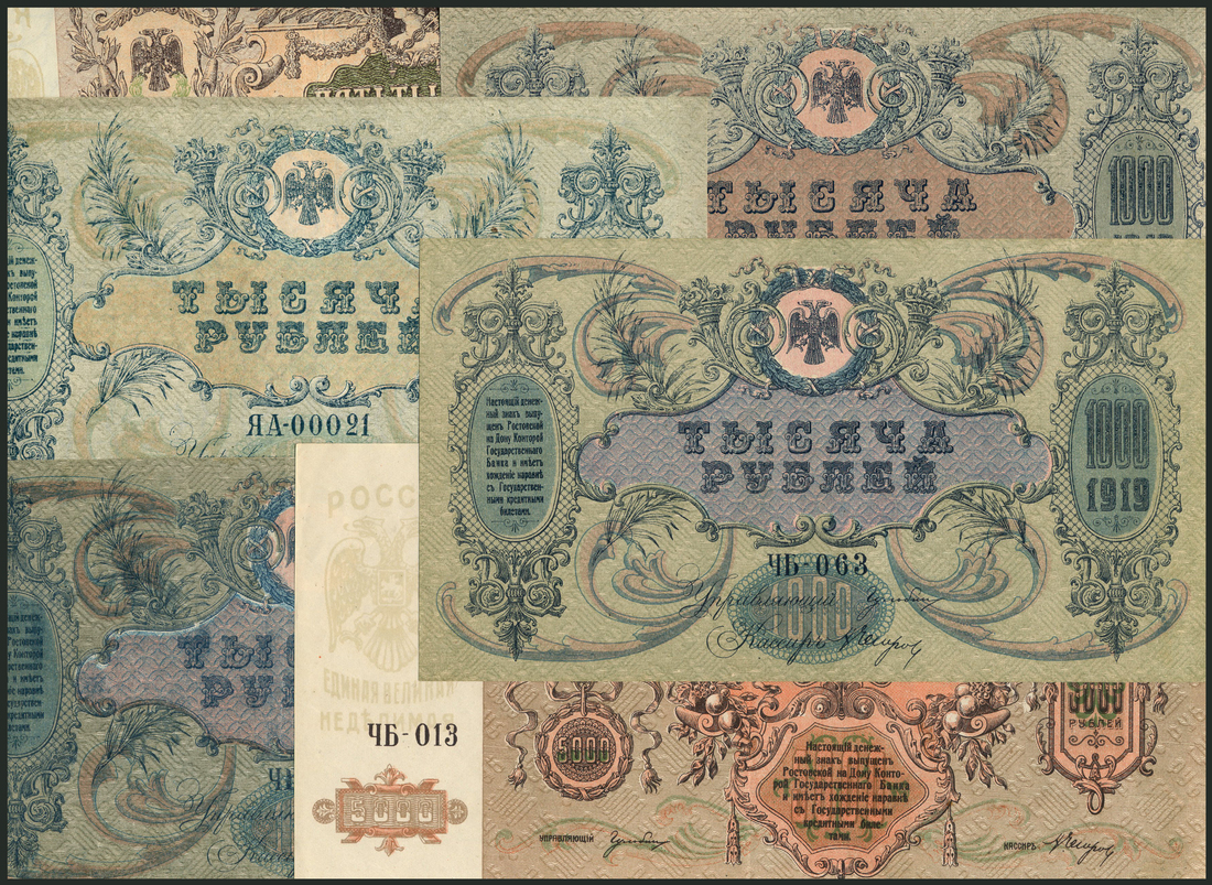 South Russia Currency Tokens Issue, 1000 rubles (4), 1919, black on blue, light green and pink underprint, double eagle at upper centre, reverse allegory of Russia at centre, buildings at left and right, 5000 rubles (2), 1919, dark brown on orange, green and light brown underprint, double eagle at upper left, Mercury at upper centre, reverse St George and snake at left, double eagle upper centre, also Government Treasury Notes, Russia, 1000 rubles, 1919, serial number OA-071, 1000 rubles, 1919, serial number RA-053, both multicolour, bell at left and St George and dragon at right, 10,000 rubles, 1919, serial number RX-083, green on multicolour, reverse seated women left and right