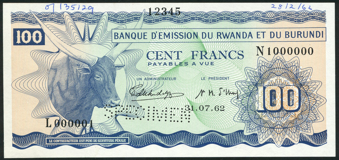 (†) Banque d'Emission du Rwanda et du Burundi, printer's archival specimen 100 Francs, 31 July 1962, serial number run L 000001 to N 1000000, signatures Fidele Nkundabagenzi and Michel d'Ursel, blue on light green and orange underprint, zebu bull at left, reverse geometric pattern and guilloche, value repeated three times, perforated SPECIMEN