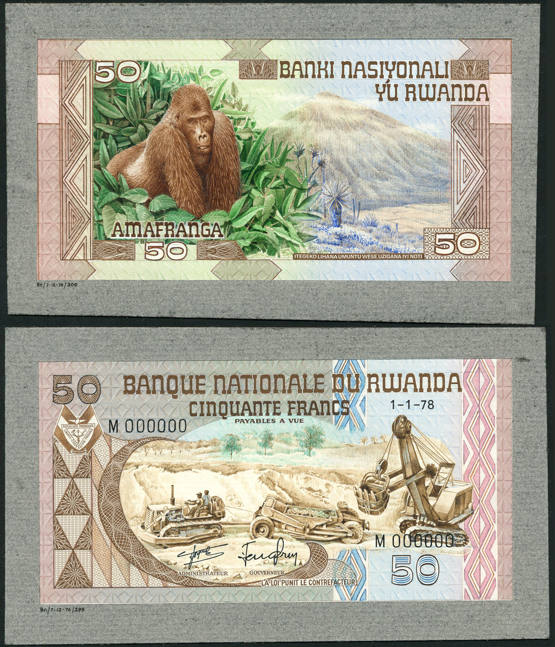 (x) Banque Nationale du Rwanda, unissued composite essay on card for 50 francs, 1 January 1978, serial number M000000, brown on multicolour underprint, mining scene at centre, elaborate border at left and right, value top left, top centre and low right, reverse, partially hand painted, gorilla in foliage at left, volcano at centre right