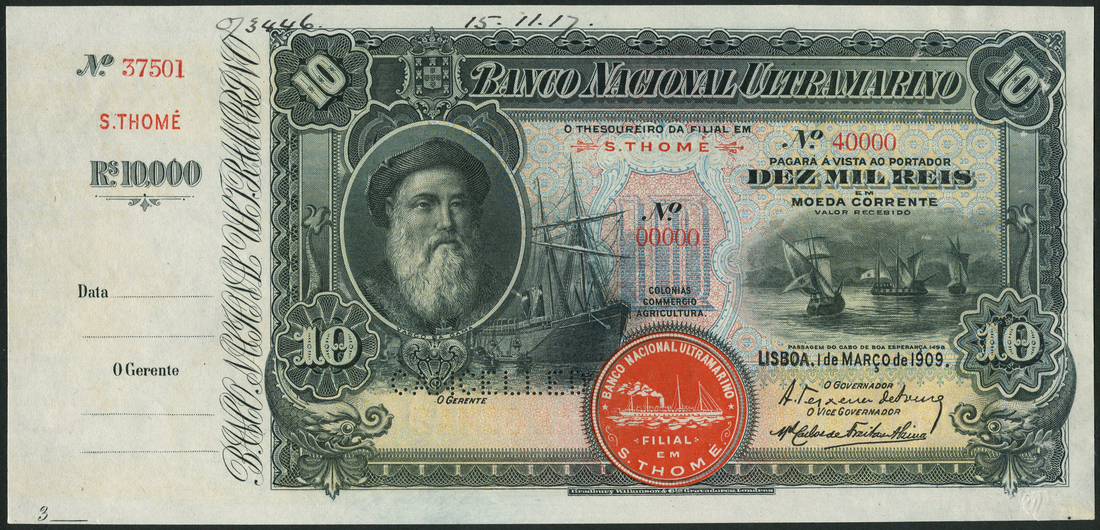 Banco Nacional Ultramarino, Saint Thomas & Prince, printer's archival specimen 10 Mil Reis, with counterfoil, 1 March 1909, serial run 00000 to 40000, black on blue, yellow and pink underprint, portrait of Vasco da Gama at left, sailing ships at right, steamship seal Type I at centre, red overprint 'S. THOME', reverse brown, woman with anchor looking at ships, perforated CANCELLED