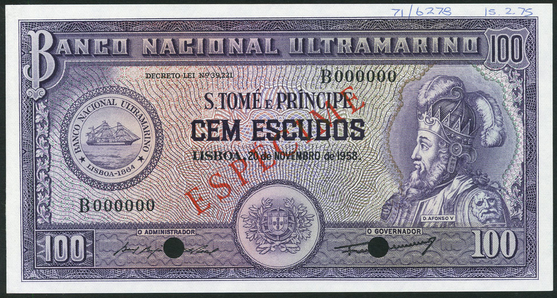 (†) Banco Nacional Ultramarino, Saint Thomas & Prince, specimen proof 100 Escudos, ND (ca 1970), no serial numbers, no signatures; printer's archival specimen 100 Escudos, 20 November 1958, serial run 240001 to B 300000; also specimen 100 Escudos, 20 November 1958, serial number B 000000, overprinted ESPECIME horizontally in red on obverse and reverse, two punch holes, all slate violet and multicoloured, all portrait of D. Afonso V at right, reverse woman looking out at ships