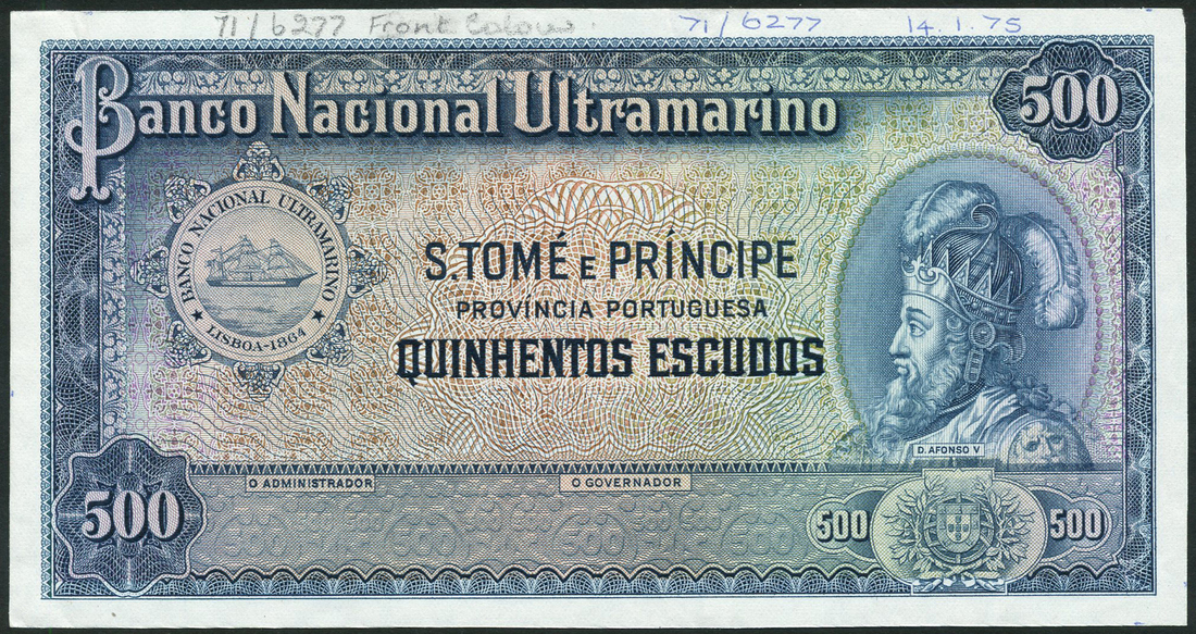 (†) Banco Nacional Ultramarino, Saint Thomas & Prince, specimen proof 500 Escudos, ND (ca 1975), no serial numbers, no signatures; printer's archival specimen 500 Escudos, 18 April 1956, serial run 040001 to 060000; also specimen 500 Escudos, 18 April 1956, serial number 000000, overprinted ESPECIME horizontally in red on obverse and reverse, two punch holes, all blue and multicoloured, all portrait of D. Afonso V at right, reverse woman looking out at ships