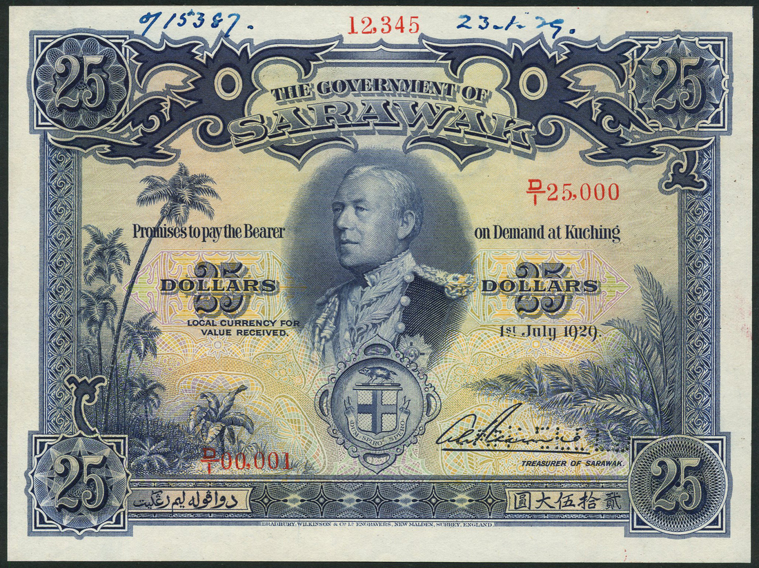 (†) Government of Sarawak, printer's archival specimen $25, 1 July 1929, serial number run D/1 00,001 to D/1 25,000, blue and multicoloured, portrait of Charles Vyner Brooke and Brooke coat of arms at centre, fronds at left and right, value in guilloches in each corner, reverse The Astana (Governor's House) in Kuching set in ornate rectangular frame, perforated CANCELLED