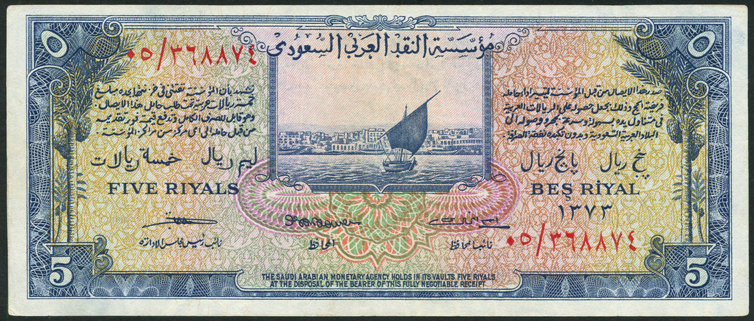 (x) Saudi Arabian Monetary Agency, 5 riyals, 1956, serial number 05/ 368874, blue on multicolour, Jiddah harbour with sailing boat, reverse coat of arms at centre