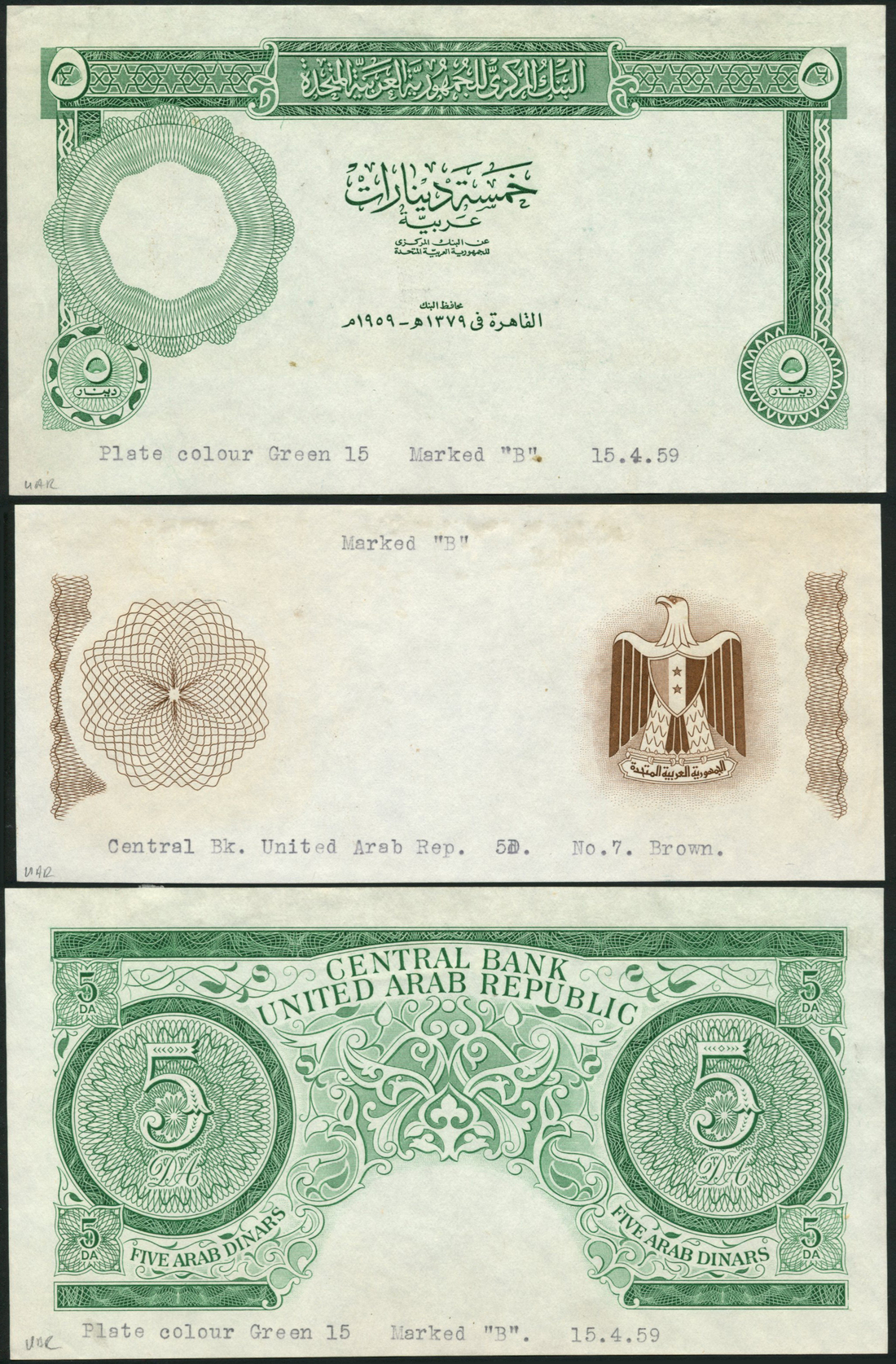 (x) Central Bank - United Arab Republic, obverse (2) and reverse die proofs for an unissued 5 Arab Dinars, 1379/1959, reverse and one obverse green, second obverse brown, showing different layers of printing, coat of arms of the United Arab Republic at right, bank legend and denomination in Arabic at upper centre, value at each corner, reverse with value at left and right, and each corner