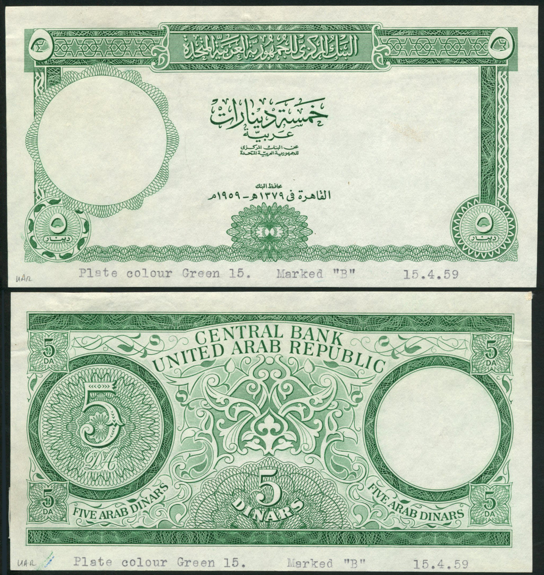 (x) Central Bank - United Arab Republic, obverse and reverse die proofs for an unissued 5 Arab Dinars, 1379/1959, green, blank space for the coat of arms of the United Arab Republic at right, bank legend and denomination in Arabic at upper centre, value at each corner, reverse with value at left, low centre and each corner
