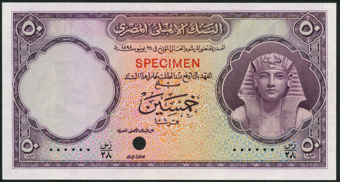 (†) National Bank of Egypt, colour trial 50 piastres, ND (1952), zero serial numbers, purple on multicolour underprint, Tutankhamen at right, value at each corner, reverse purple, waterside temple at centre, red SPECIMEN overprint, single cancellation hole