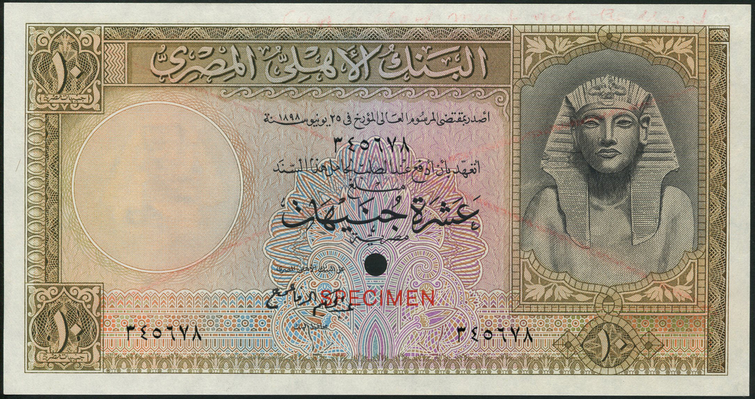 (†) National Bank of Egypt, colour trial 10 pounds, ND (1952), serial number 345678, olive brown on multicolour underprint, Tutankhamen at right, value at each corner, reverse olive brown, temple ruins at centre, red SPECIMEN overprint, single cancellation hole