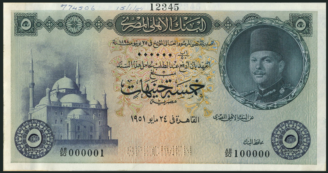 (†) National Bank of Egypt, specimen £5 (3), 1948, serial numbers AB/50 000001-AB/50 100000 to AB/52 000001-AB/52 100000, blue-green and multicoloured, King Farouk at right, the Citadel of Cairo at left, reverse green, river God (Nilos) and his thirteen sons, value at left and right