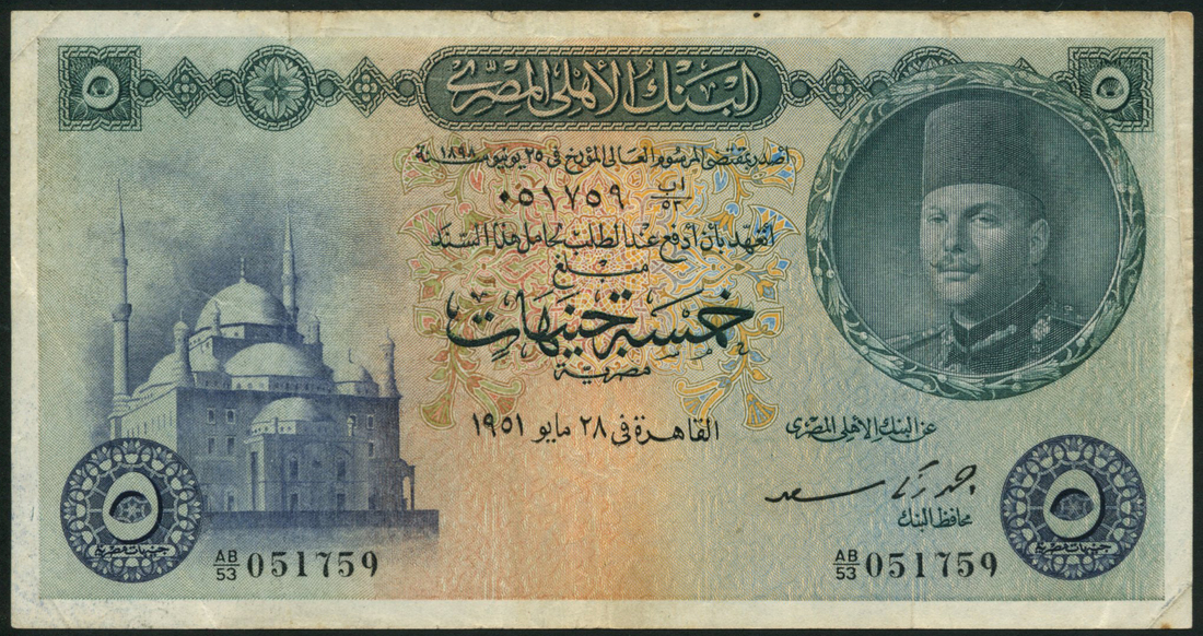 (x) National Bank of Egypt, £5, 1951, serial number AB/051759, blue, green, violet and brown, portrait King Farouk at right, citadel of Cairo at right, reverse green, allegorical scene, Saad signature