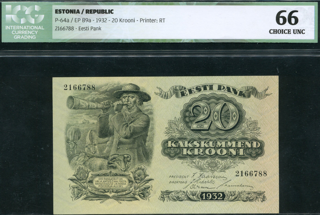 Bank of Estonia, 20 krooni, 1932, serial number 2166788, black on pale green underprint shepherd at left, value at right, reverse multicoloured, arms at left