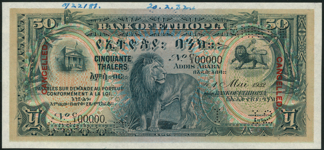 (†) Bank of Ethiopia, specimen 50 thalers, 1 May 1932, serial number C/1 00000, blue-grey on multicolour underprint, Lion at centre, bank building at upper left, lion with sceptre at upper right, value at each corner, red CANCELLED overprints and perforations