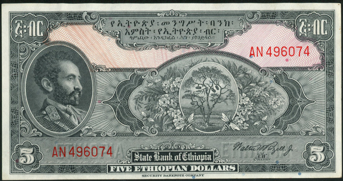 State Bank of Ethiopia, $5, ND (1945), serial number AN496074, grey, black and red, portrait Emperor Haile Selassie at left, bees and flowers, acacia tree with beehives, reverse, orange, Lion of Judah (crowned passant lion holding a cross) at centre, value in each corner, also $100, ND (1966), serial number C727219, 1 birr, ND and 50 birr, ND