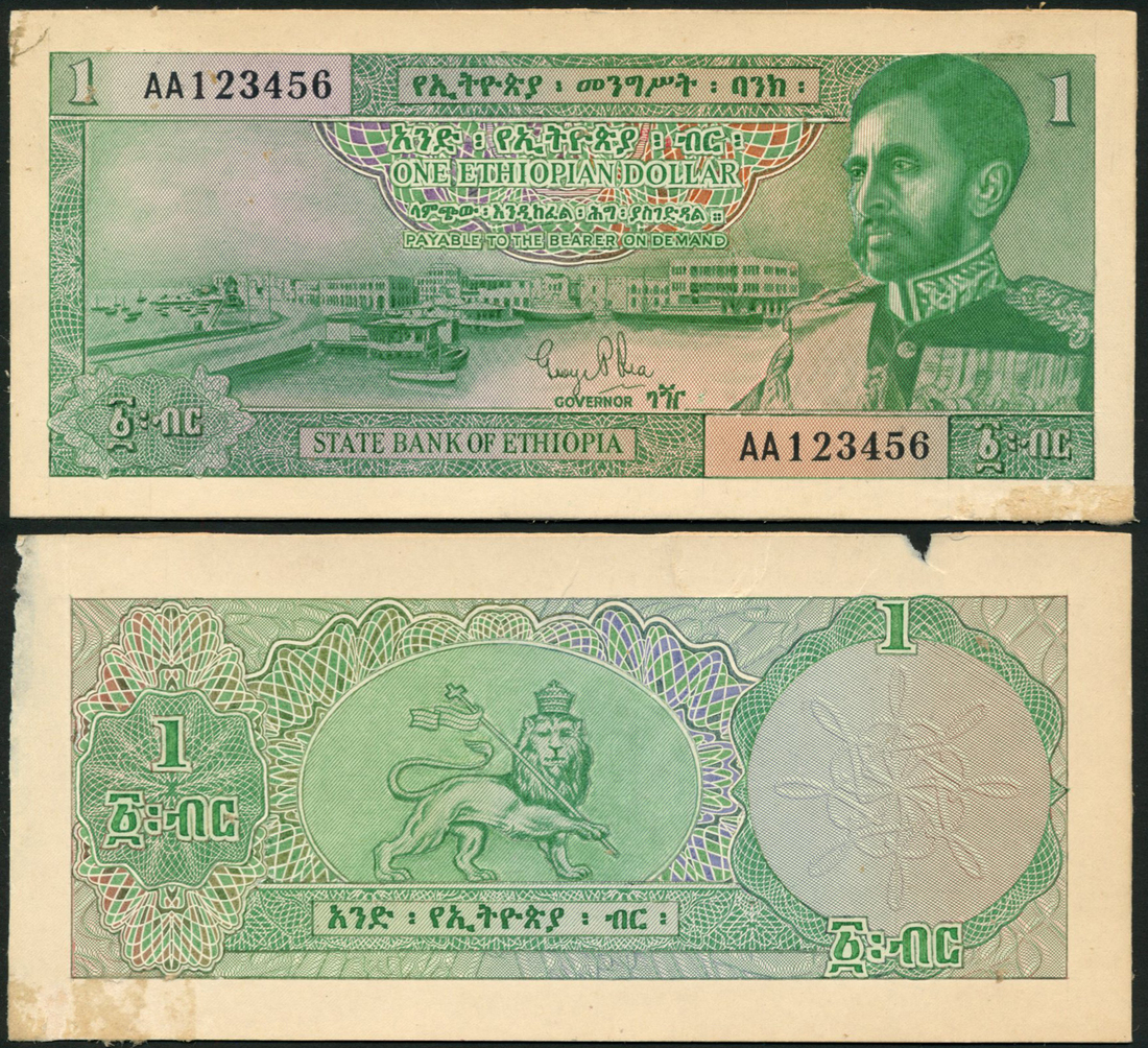 (†) State Bank of Ethiopia, an obverse and reverse composite essay on card for a 1 Dollar, ND (1957), serial number AA123456, signature George P. Rea, green and lilac, unadopted portrait of Emperor Haile Selassie at right, Massawa waterfront at centre left, reverse Lion of Judah