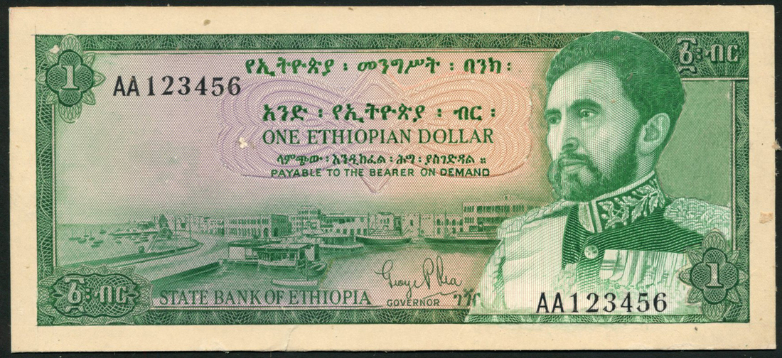 (†) State Bank of Ethiopia, an obverse composite essay on card for a 1 Dollar, ND (1957), serial number AA123456, signature George P. Rea, green and lilac, unadopted portrait of Emperor Haile Selassie at right, Massawa waterfront at centre left (Pick and Linzmayer unrecorded),